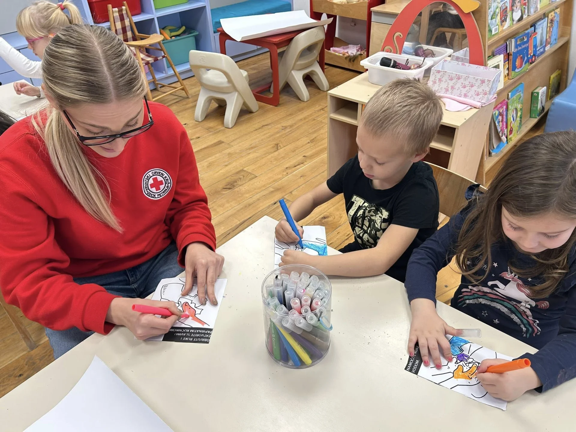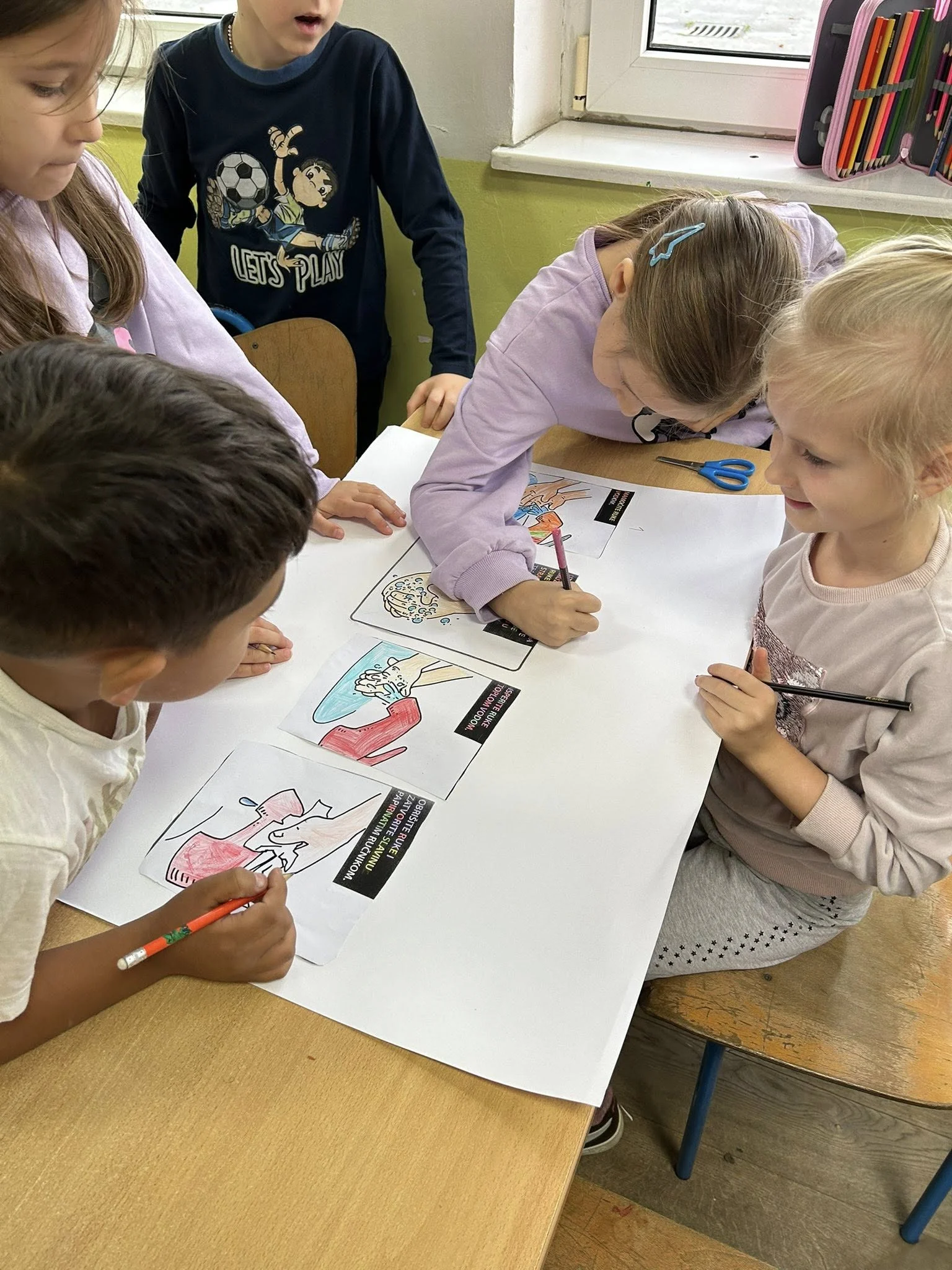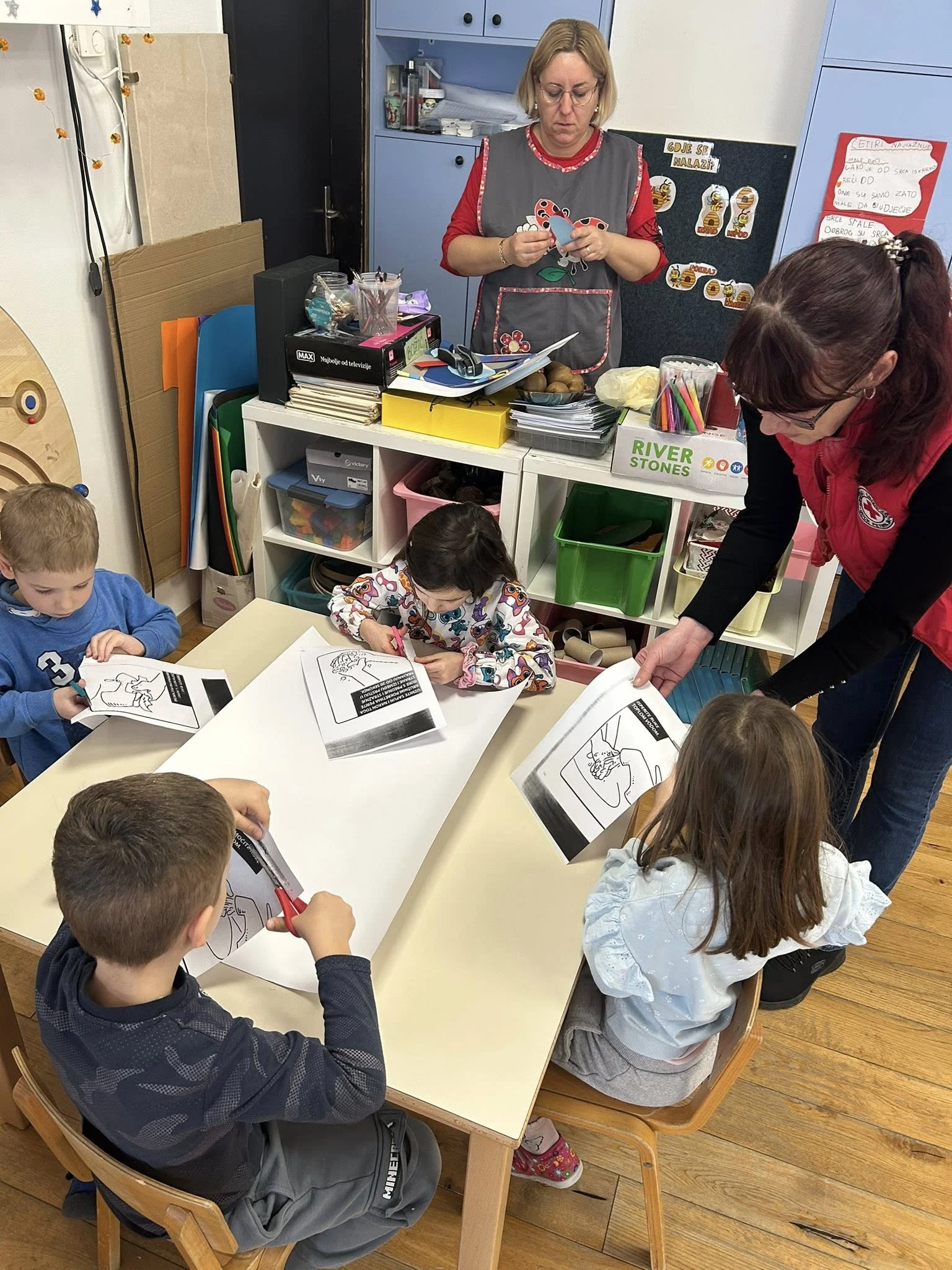 Djeca su kroz radionicu pravilnog pranja ruku i kreativne aktivnosti, poput izrade plakata, crtanja i rezanja, učila na praktičan i zabavan način. Ovakav pristup pomaže u razvoju higijenskih navika i svijesti o zdravlju od najranije dobi. ![]()