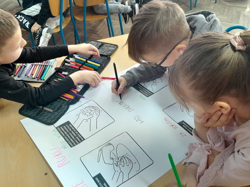 Kroz radionicu i vježbu ponovili smo sve radnje pranja ruku te izradili plakate kako ispravno prati ruke i po kojem redu.